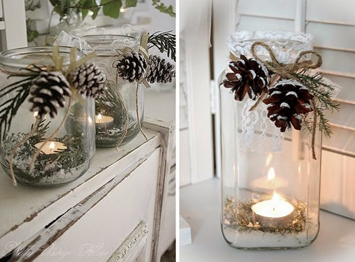 Un tarro de conserva ponle sal gorda imitando la nieve, una vela y por fuera se decora con un encanje o puntilla sujeto con cordel y unas piñas para terminar.