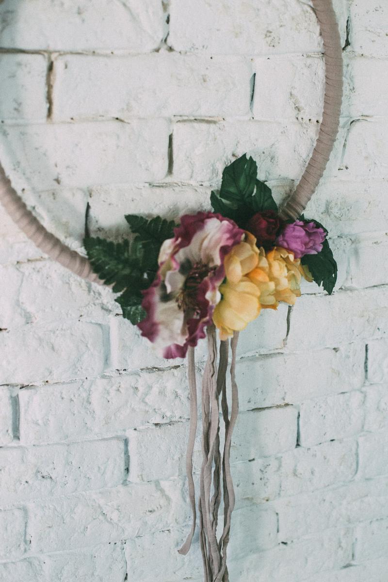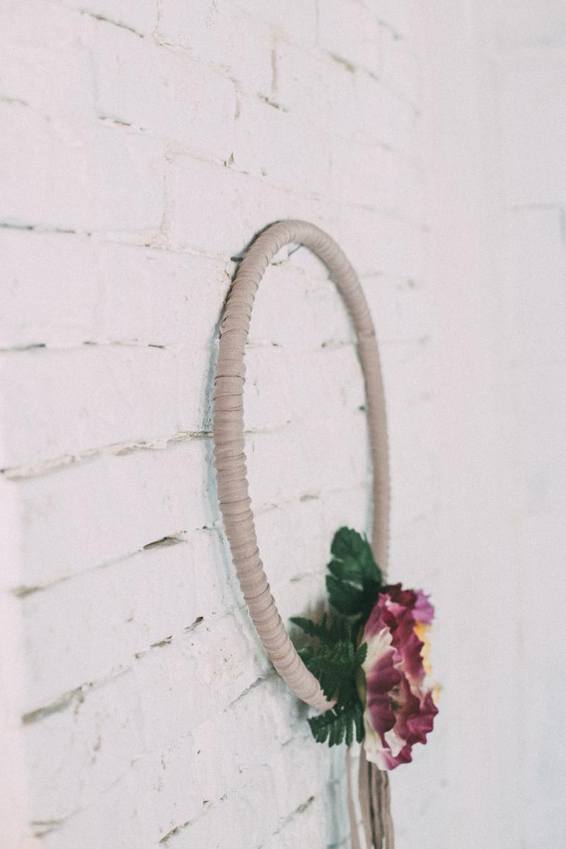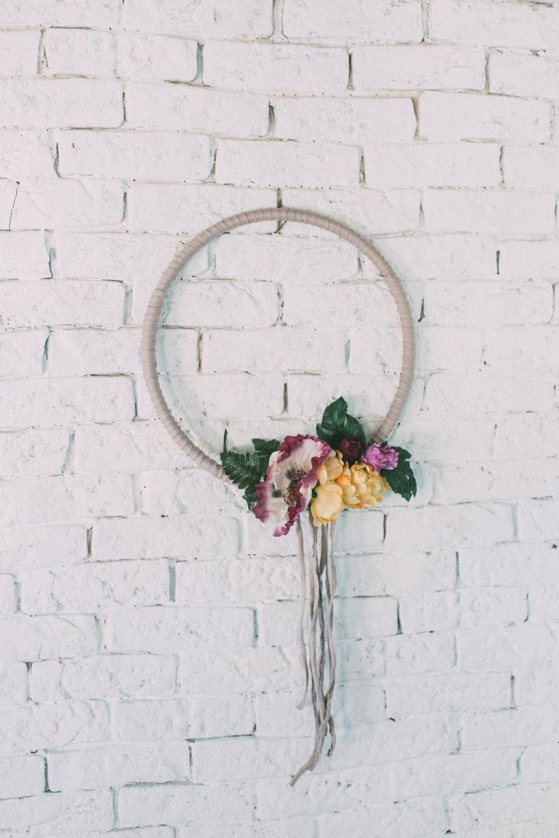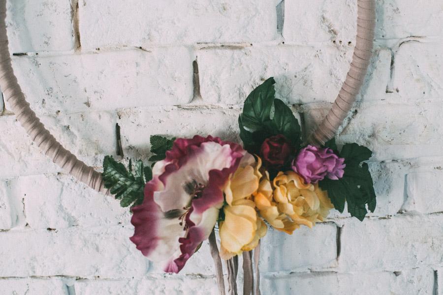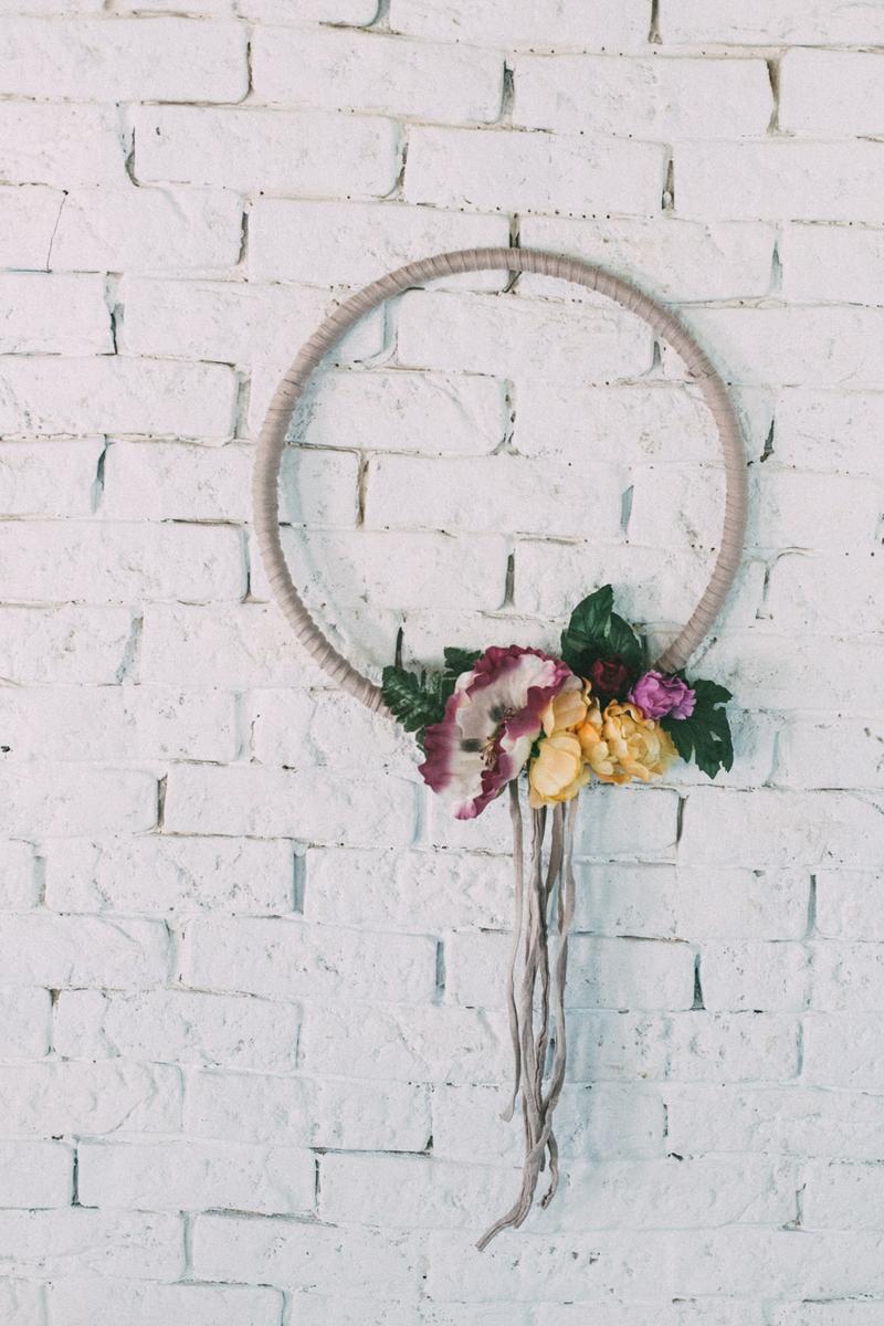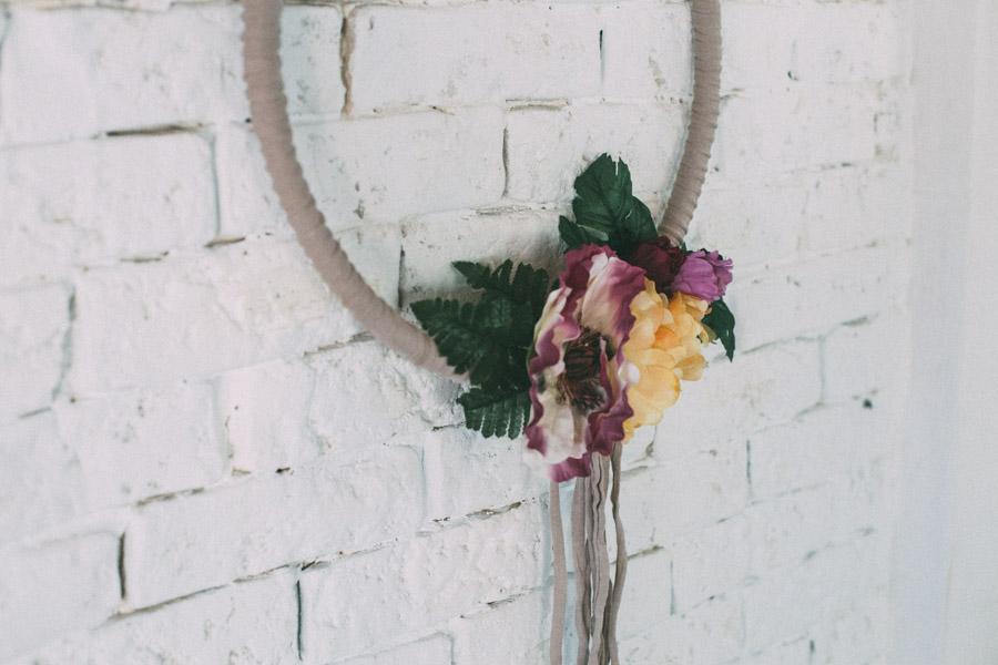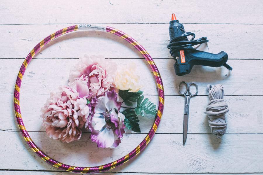 Materiales: Aro, trapillo, tijeras, pistola silicona, flores y hojas. Materiales que seguro que tenéis cerca.