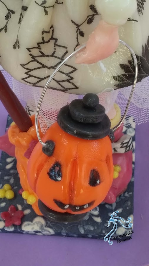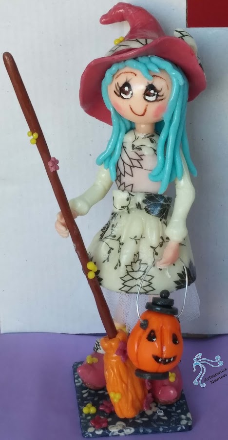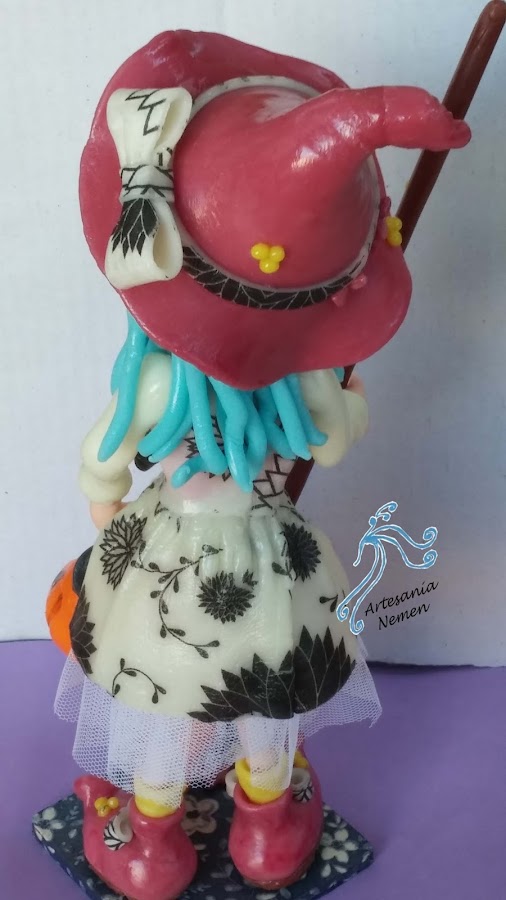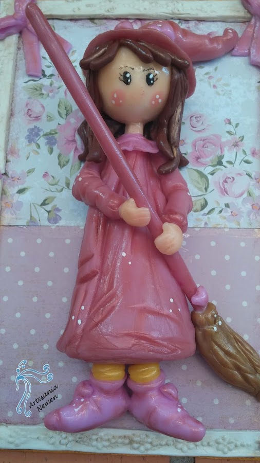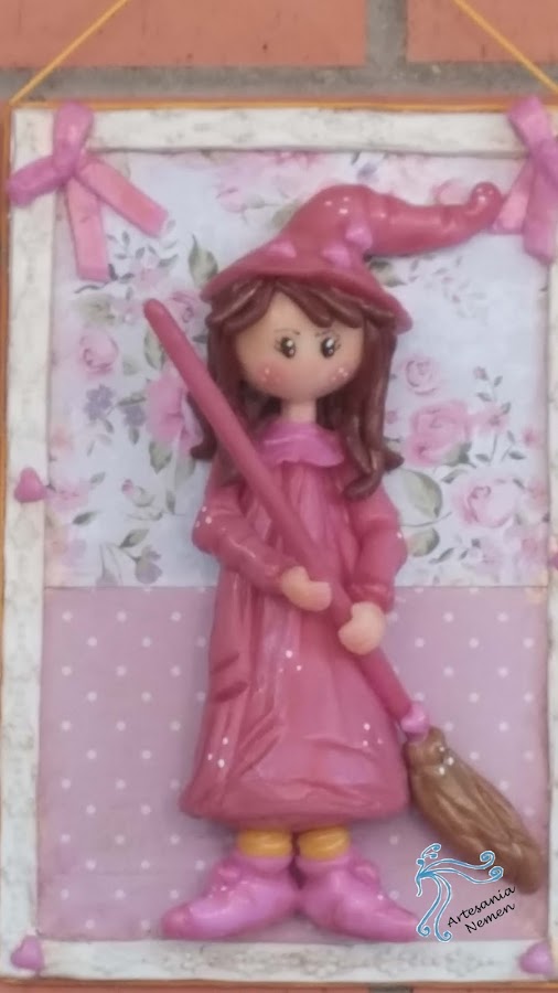 Es un cuadro de una brujita de porcelana fría, el marco es del mismo material y os muestro el detalle en la foto superior, espero que os guste tanto como a mi, también voy a aprovechar para presentar otra brujita que he hecho estos días aunque no sea para la pared.