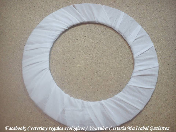 Empezamos a amarrar los rectángulos de telas alrededor de la rueda de cartón, haciendo un doble nudo por la parte exterior... si usamos dos colores, alternar estos...