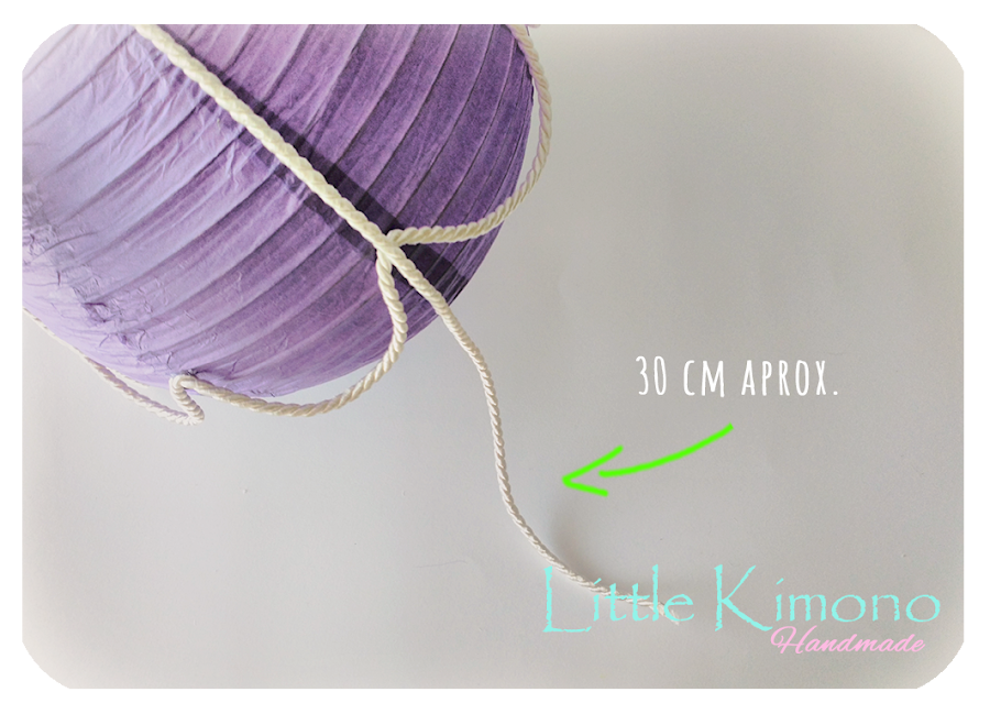 2. Segundo paso: La lámpara trae ocho marcas verticales en el papel, sobre cada una de ellas (hacia la mitad de la lámpara) pegaremos con la pistola termofusible unos trozos de cordón a modo de "guirnalda" como muestra la foto.