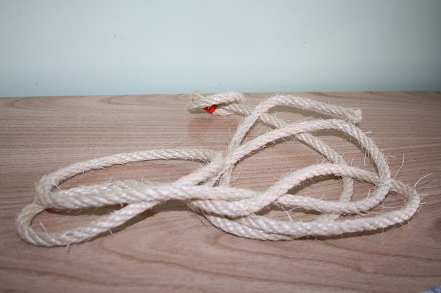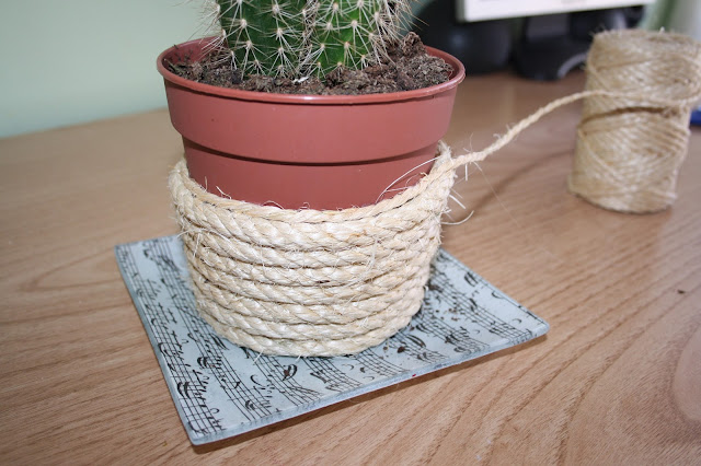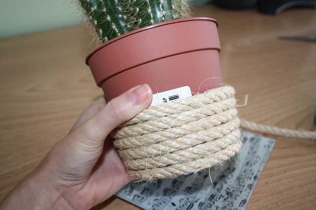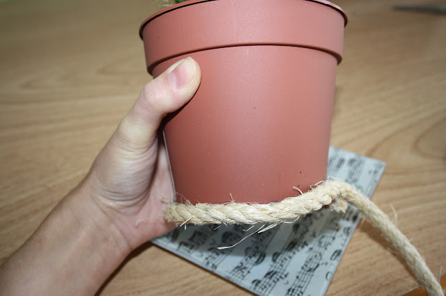 A continuación, con la cuerda más fina, seguiremos enrollando la cuerda y pegándola a la maceta.