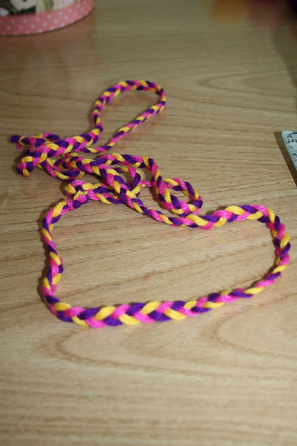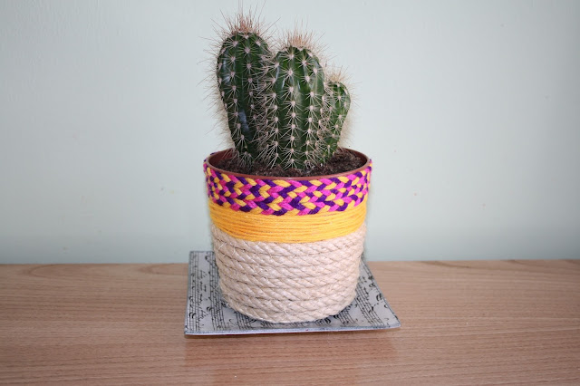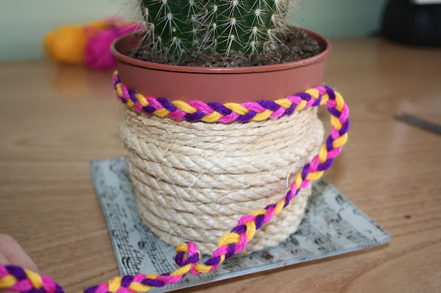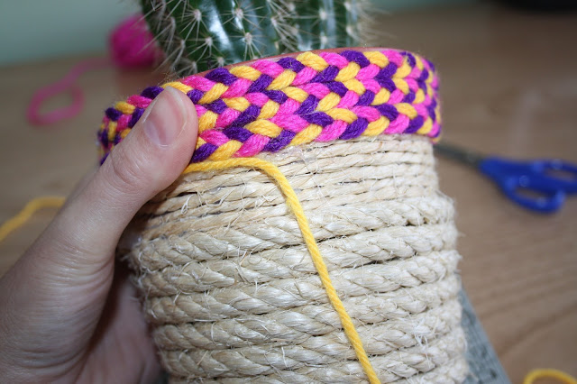 Con la lana de colores, haremos una trenza lo bastante larga para enrollarla varias veces sobre la maceta. Y seguimos pegando, pero esta vez por la parte superior.