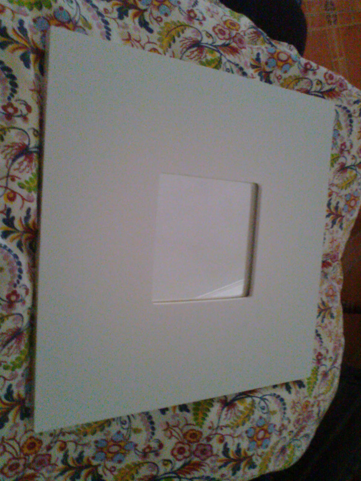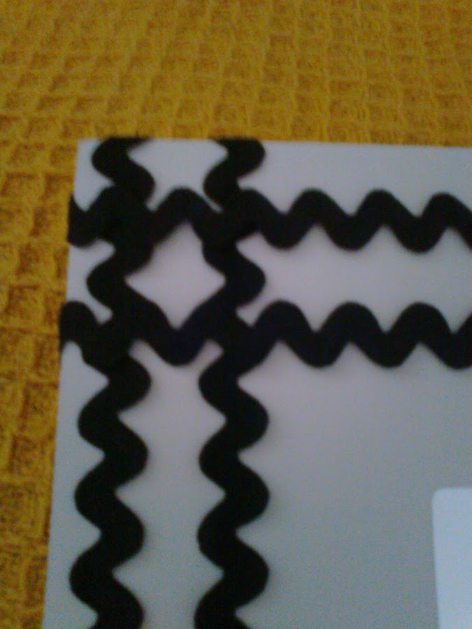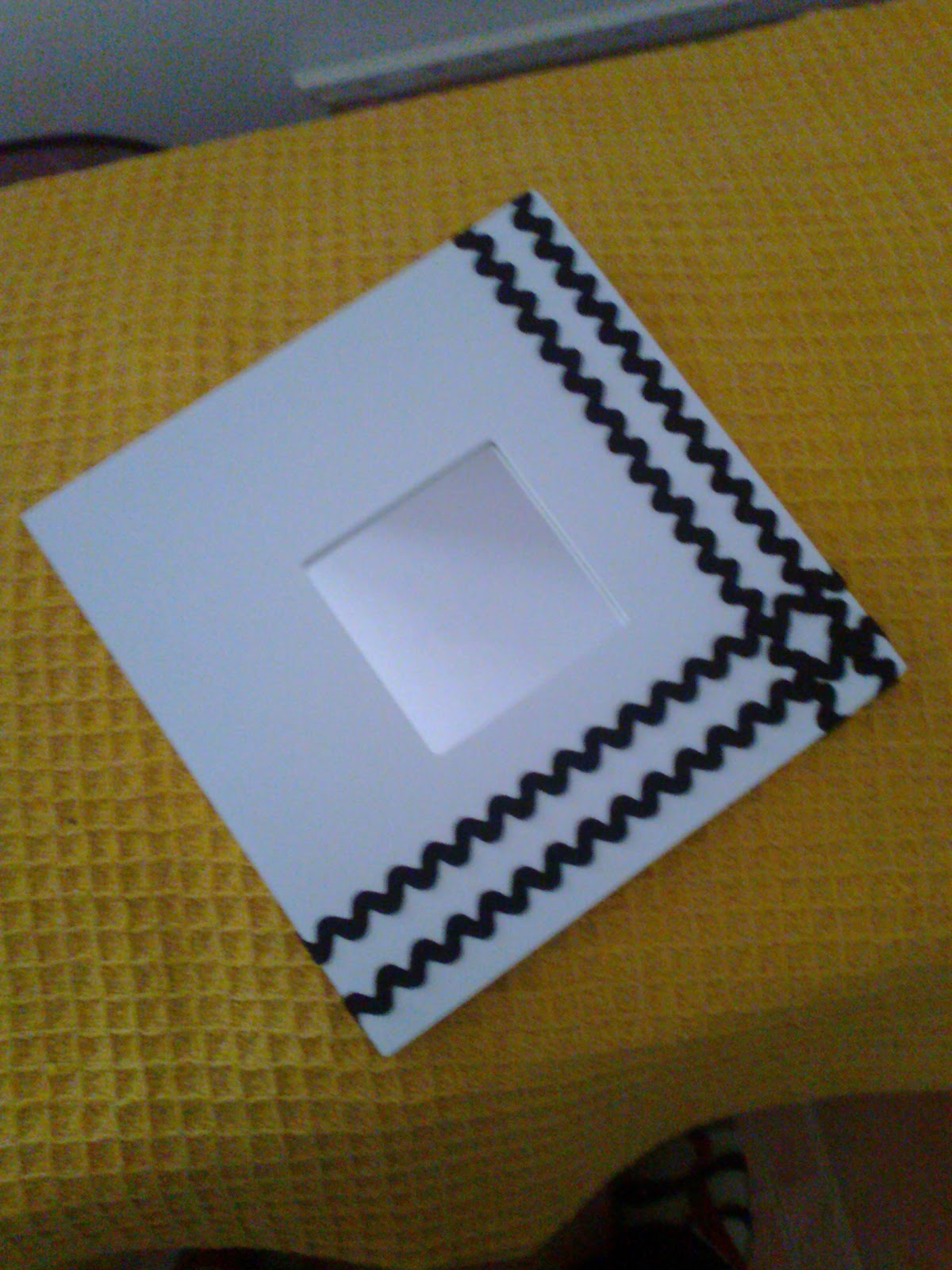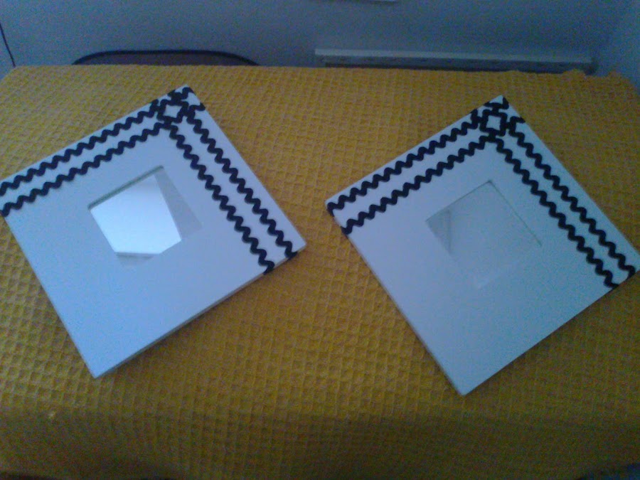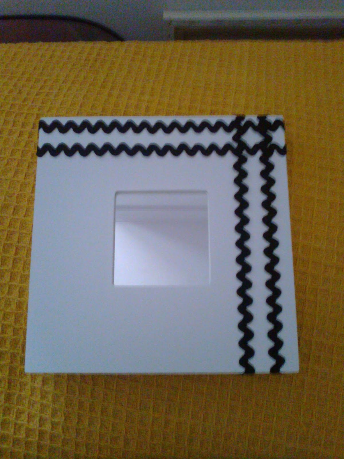 Pinte los espejo con pintura blanca para madera, le di varias manos, cuando estas estaban bien secas, le di el barniz, y después le fui pegando ondulina negra al gusto,