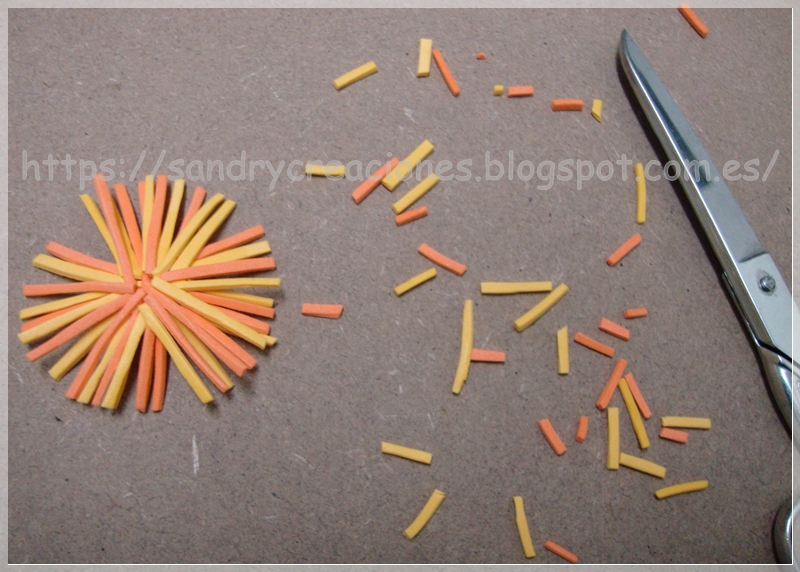 Y finalmente hacemos un cojín de paja donde reposará nuestro huevo de pascua, para ello cortamos tiras finas de goma eva amarilla y naranja y las pegamos de forma que queden formando una estructura circular sobre una pequeña base cuadrada: