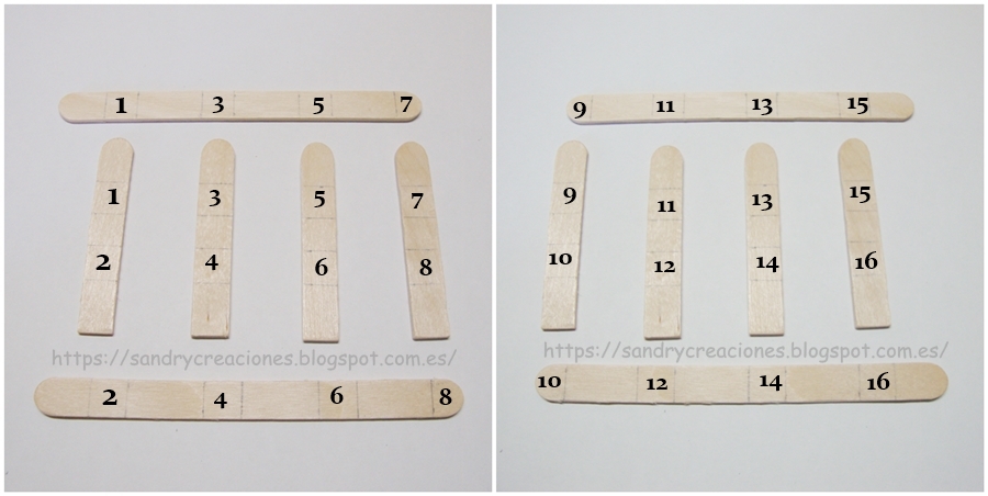 Cuando tengamos todos los palos cortados los colocamos de la manera correspondiente para montar la cerca y los ensamblamos según las marcas que habíamos hecho a lápiz anteriormente y procedemos a pegarlos con cola blanca. En la siguiente imagen podéis ver con números los puntos de pegado: