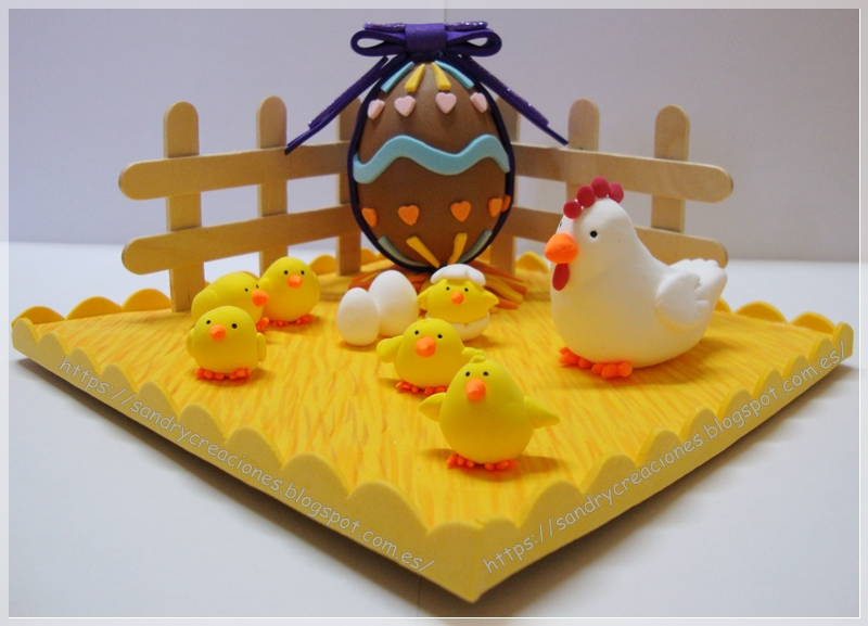 Para no hacer muy largo el post hemos decidido que en este vamos a explicar como hemos realizado las figuras de pasta moldeable y el decorado y en un próximo post explicaremos como realizamos y decoramos el huevo de pascua que acompaña al decorado.
