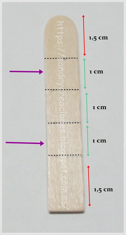 En los 8 palos obtenidos también marcamos con lápiz dónde irían colocadas las barras laterales, concretamente en las porciones de 1 cm señaladas con las flechas lilas:
