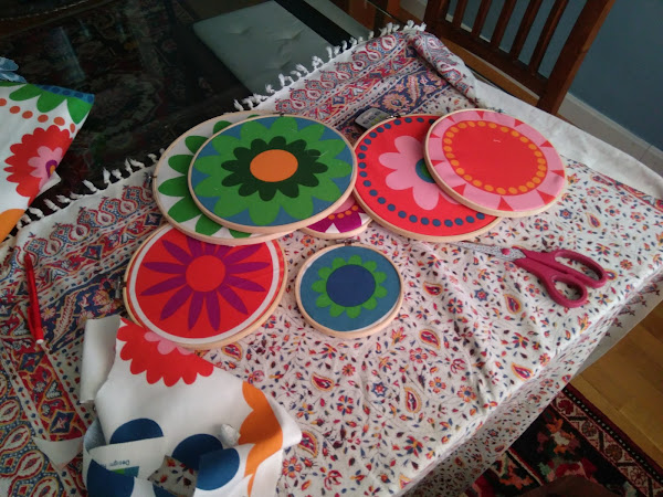 En este caso hemos elegido una tela de Ikea que tiene flores de diferentes colores y formas adaptándolas a los bastidores.