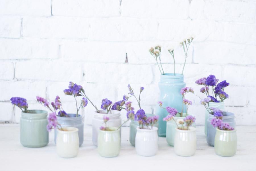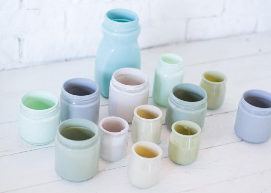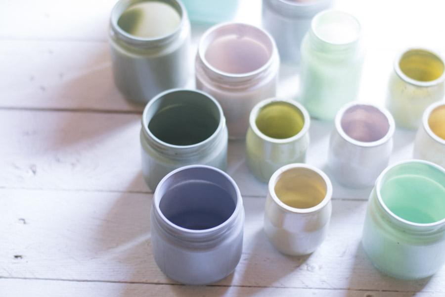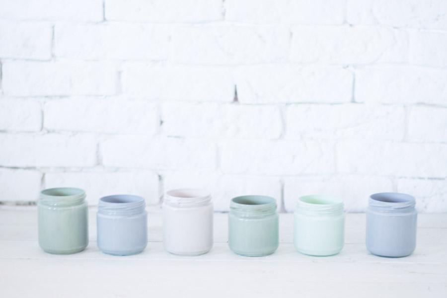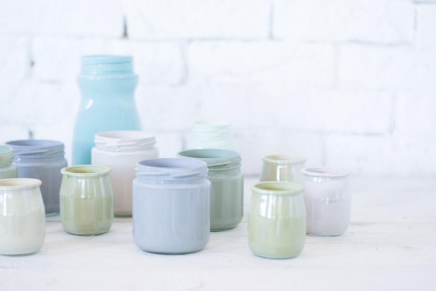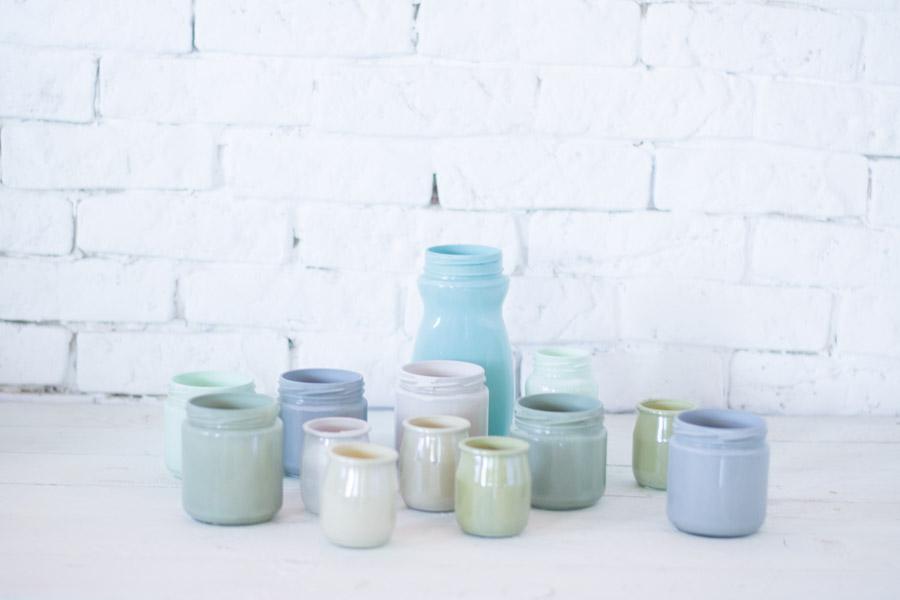 Solo necesitas botes y tarros de cristal de diferentes tamaños y pintura. En este caso he utilizado pintura en spray, pero también podéis hacerlos con pintura normal añadiendo a la base y moviendo el frasco para repartir la pintura elegida.