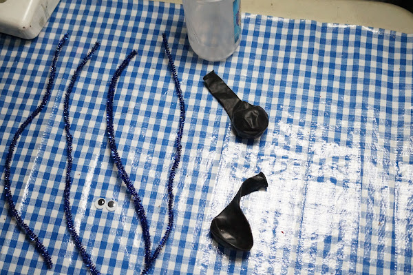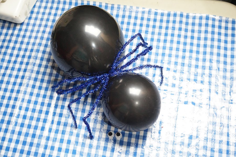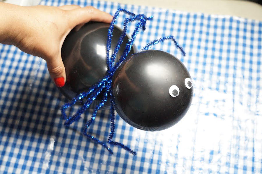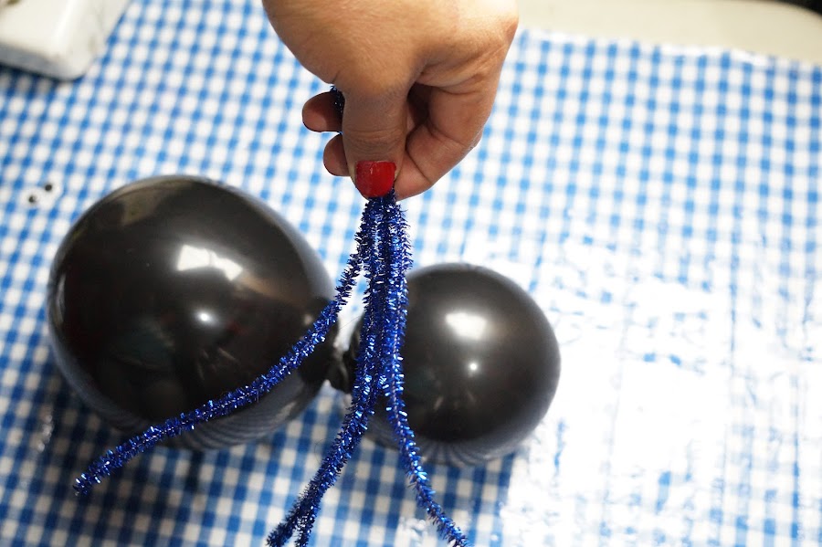 Ahora tomaremos los 4 limpia pipas y doblaremos por la mitad para enrollar sobre su propio eje y así colocar entre los dos globos, pegándolo ya sea con silicon frío o con cinta.