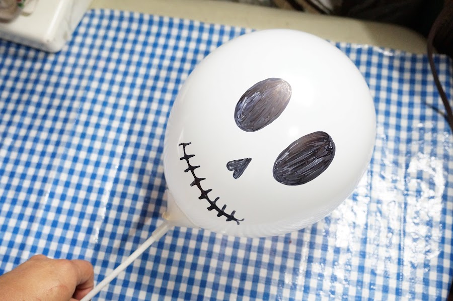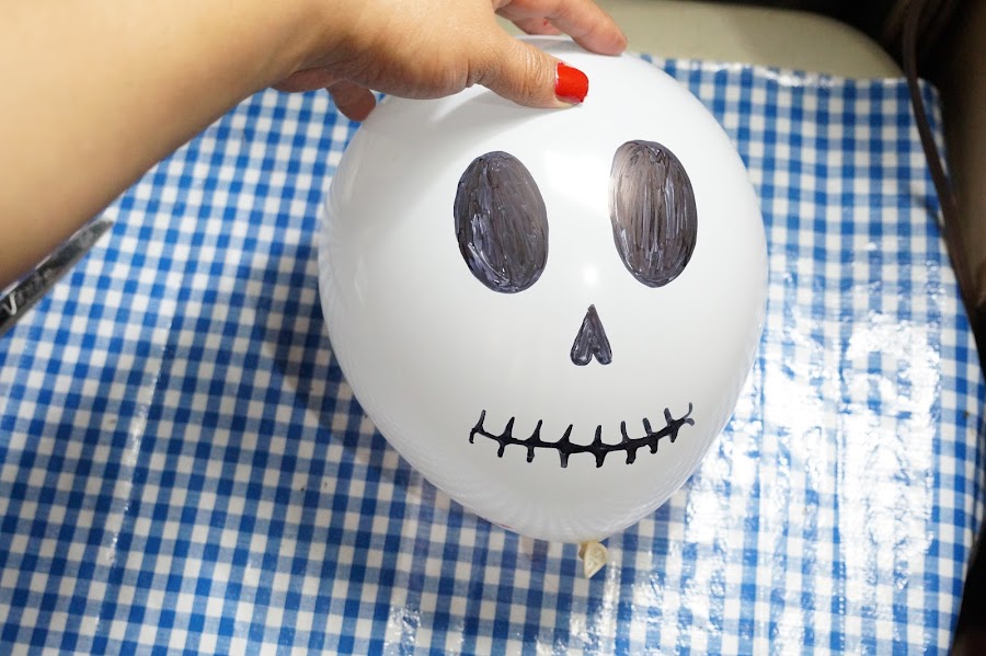 Para el globo calavera, lo único que vas a realizar es pintar la cara con el plumón negro, y listo el primer proyecto.