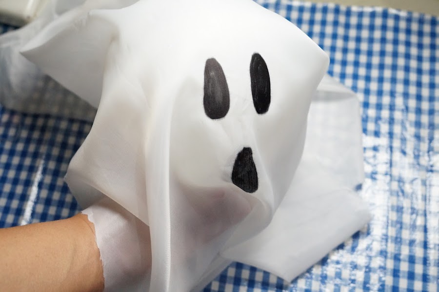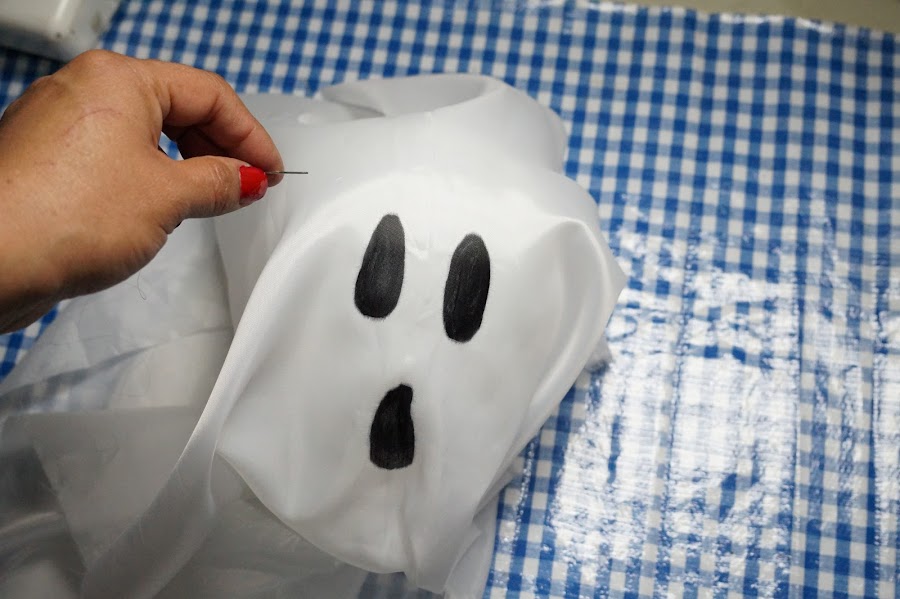 Vamos a utilizar un globo blanco que en la parte ancha vamos a colocar un punto de silicon frío para colocar la tela encima y no se caiga. Ahora pintaremos su carita con plumón negro. Para colgarlo utiliza hilo y aguja, que atravesaras en al parte de arriba de la tela, con cuidado de no picar el globo y listo, ya tenemos otra decoración muy fácil y decorativa.