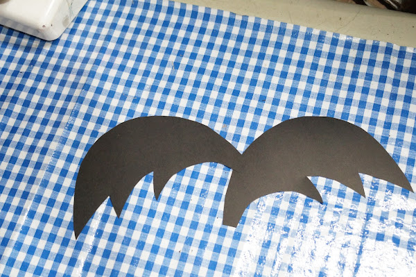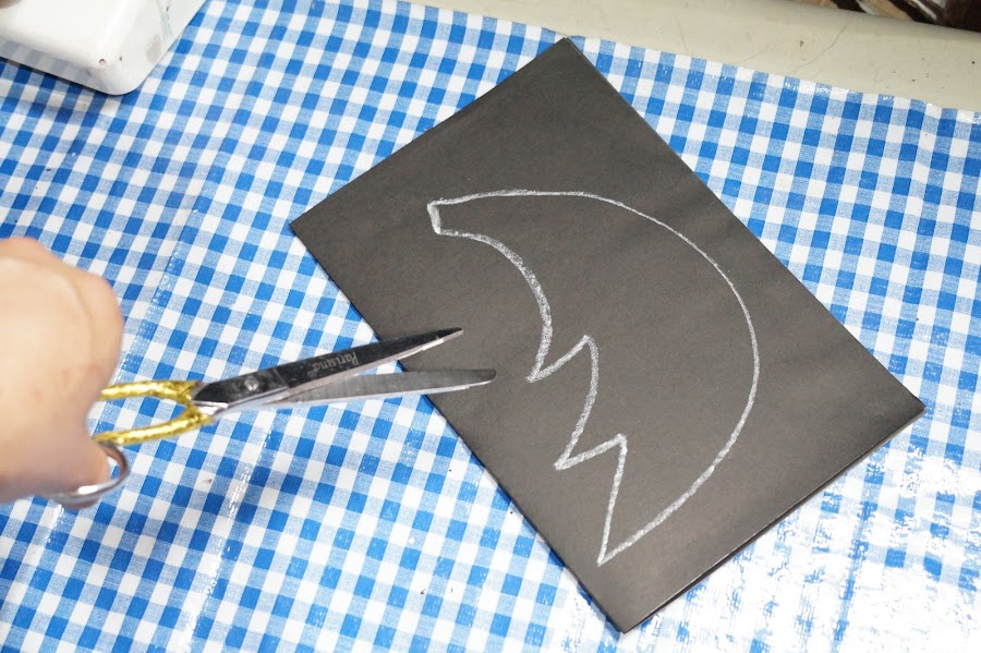 Vamos a inflar un globo negro, ahora en el papel negro, doblaremos a la mitad y dibujaremos unas alas, para recortarlas