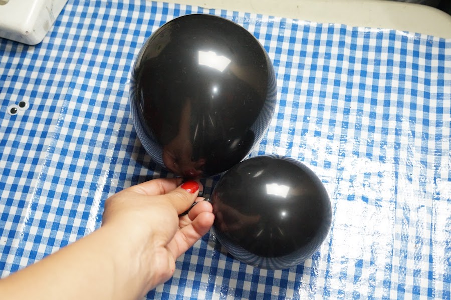 Utilizaremos dos globos negros que inflaremos uno mas chico que otro para que formen el cuerpo y la cabeza. Los unimos por las boquillas.