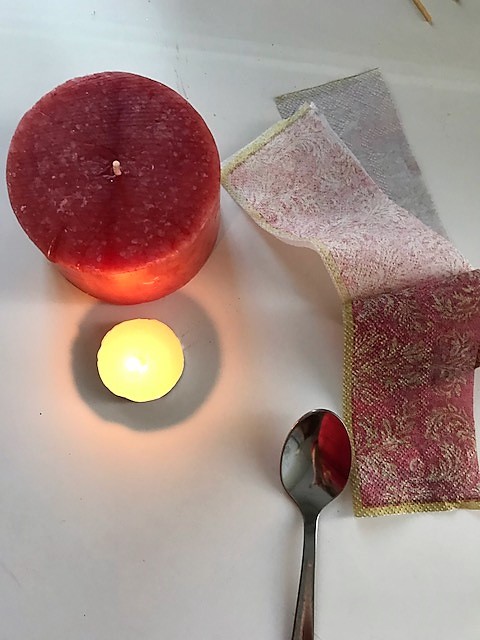 y a continuación preparamos nuestra velita para calentar la cuchara y cogeremos el trozo de servilleta a utilizar dejando solo la capa fina con el dibujo...