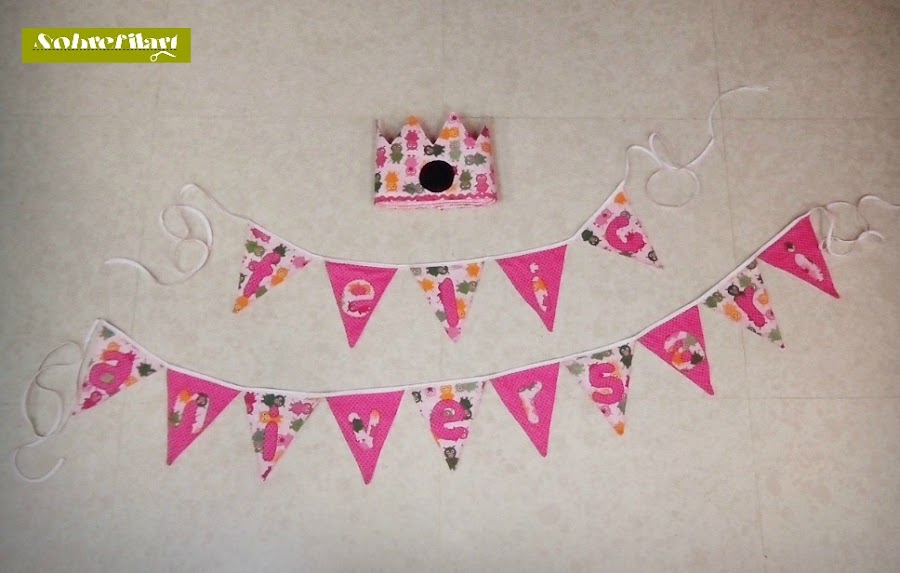 En las banderolas se puede poner la frase que queráis o incluso el nombre del cumpleañero. Si te gusta nuestro kit de cumpleaños y quieres encargar el tuyo tan solo tienes que ponerte en contacto con nosotras mediante email (sobrefilart@gmail.com)