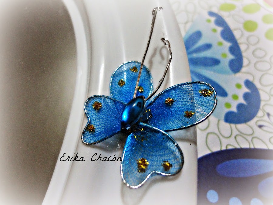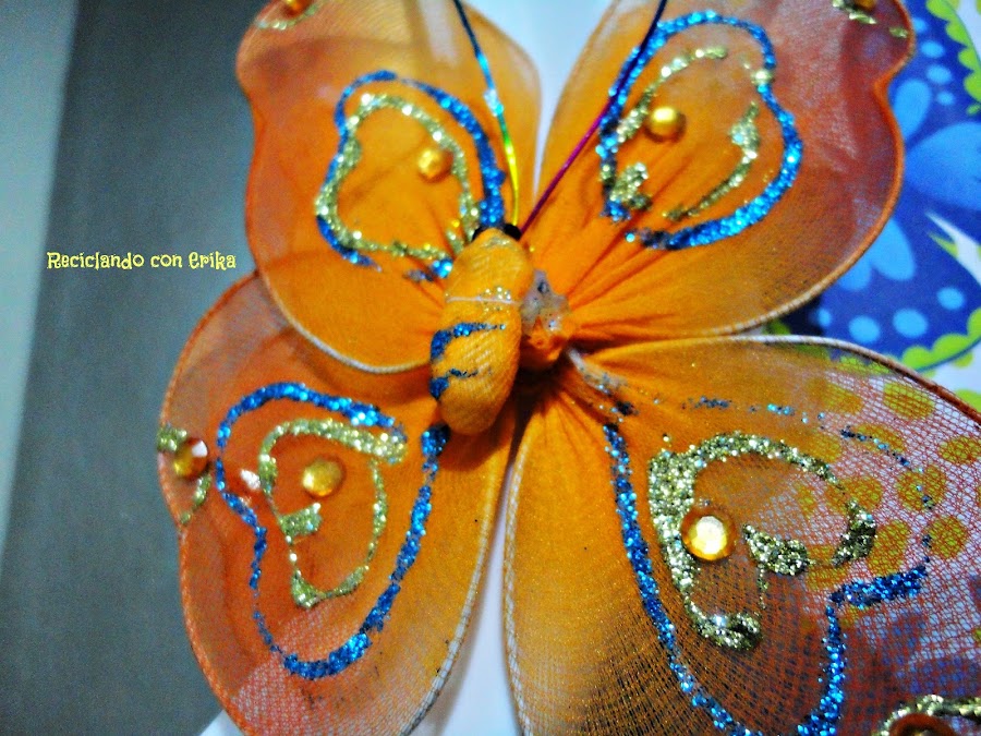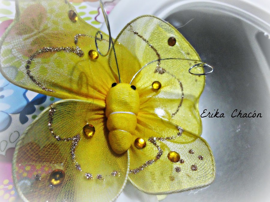 Las mariposas de tela siempre son hermosas y le dan un toque muy "chic" a las manualidades , algunas de ellas las saque de unos recuerdos que me dieron cuando fui a unos quinceaños :) asi que podríamos decir que recicle los adornos .