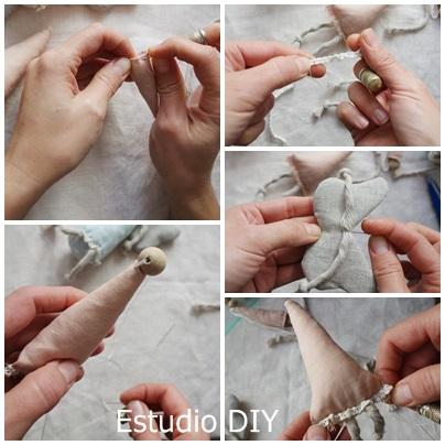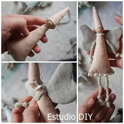 Seguidamente, cosemos el cordón que forman los brazos al centro de las alas, con unas puntadas a mano.
