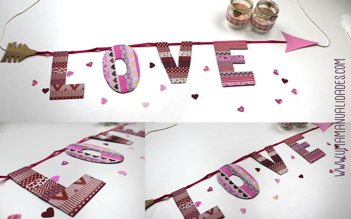 Una guirnalda decorativa para San Valentín muy fácil de hacer que podemos realizar reciclando cartón y con algunos washi tapes, son este tipo de guirnaldas con mensajes que nos pueden ayudar añadir un toque diferente con una decoración romántica para San Valentín de lo más estupenda.