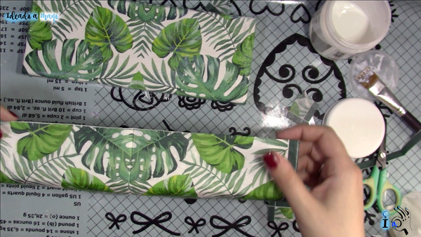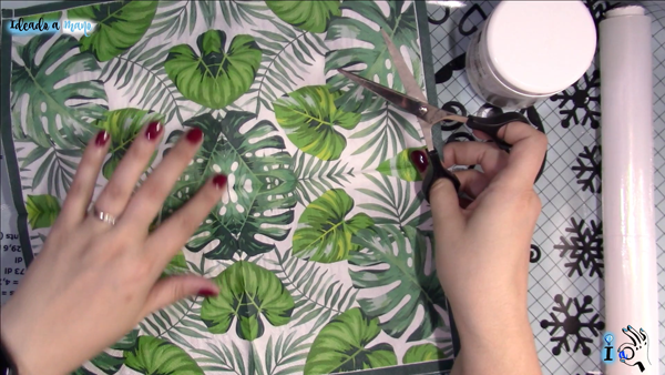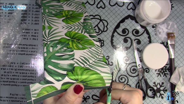 Y como os digo hago decoupage con esta servilleta tan chula. Tiene motivos de monstera y otras hojas tropicales como la costilla de adán y a mi me gusta mucho.