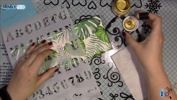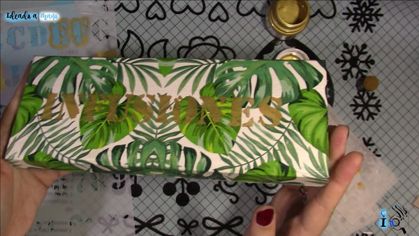 Cuando ha secado el decoupage hago un stencil en la tapa que ponga "INFUSIONES". Utilizo el color dorado para que así vaya a juego con los herrajes, que también eran dorados.