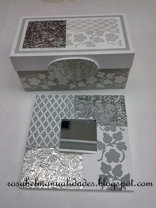 Está pintado en color blanco y piedra y decorado con modeling paste de Artis y estaño repujado.