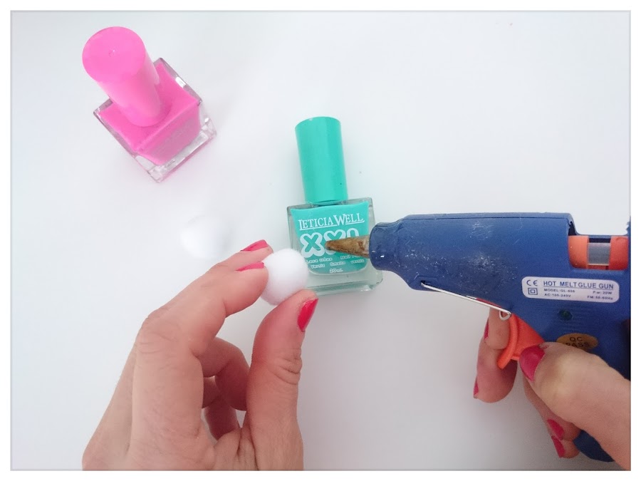 Pegar con la pistola de silicona caliente, los pompones de colores al pintauñas, que serán la cola del conejo, yo las elegí en color blanco... pero de colores es otra opción que quedaría genial.