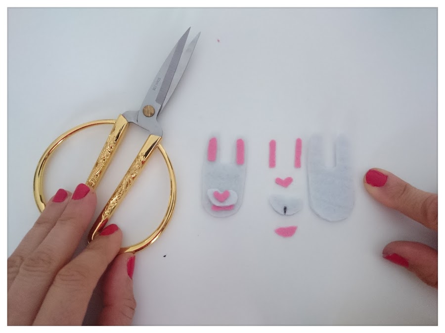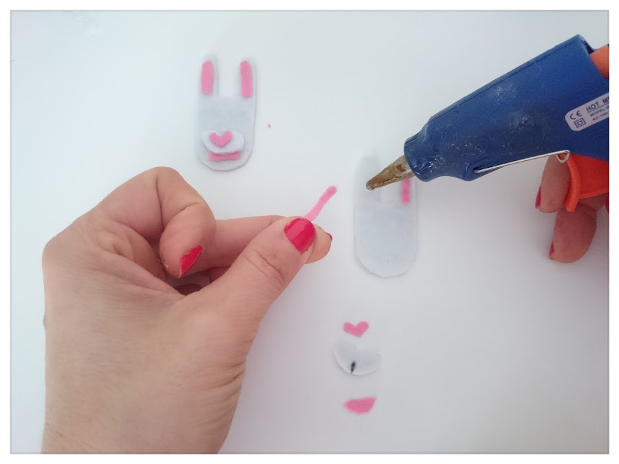 El segundo paso será pegar las piezas de fieltro, para formar la cabeza del conejito, yo utilicé para ello la pistola de silicona caliente, pero también se puede utilizar pegamento textil, primero pegar los interiores de las orejas de color rosa sobre la pieza de la cabeza del fieltro de color blanco, después pegar la lengua lo siguiente el hocico y encima la nariz que es el pequeño corazoncito rosa, todo en ese orden que he enumerado, como veis es todo super sencillo y muy facilito de hacer.