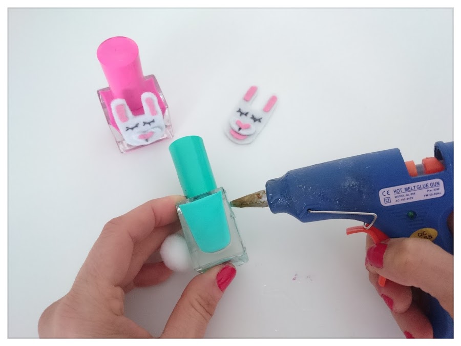 Ya por último pegar la cabeza del conejo en el pintauñas utilizando la pistola de silicona caliente.