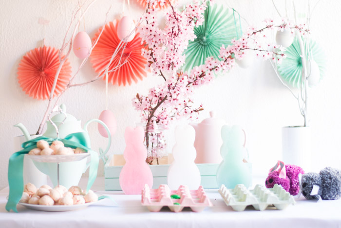 Elige dos o tres colores para la decoración de tu mesa. En mi caso, el rosa, mint y blanco, y fue porque después de Navidad encontré unas velas de conejito, muy muy baratas. Resulta que este año en varias tiendas la decoración de pascua, ha sido en esos tonos, así que compré unos adornos de papel para la pared, y el conjunto quedo ideal.