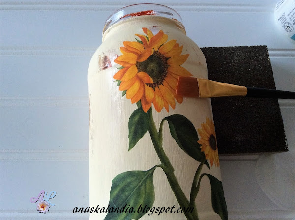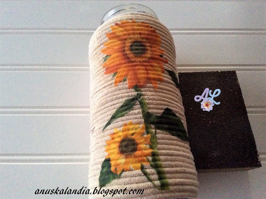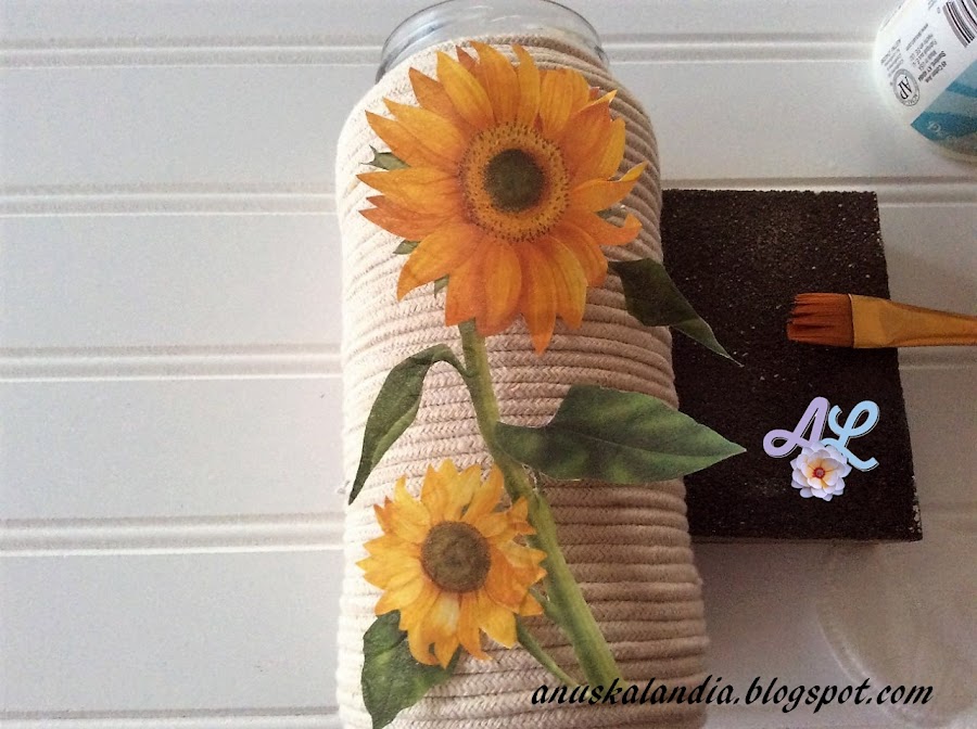 4.- Cuando ambos motivos estén secos en ambos frascos, procederemos a pasarlos una capa de barniz. En el caso del frasco pintado, en todo él. En el caso del de cordón de macramé, sólo en el motivo del girasol.