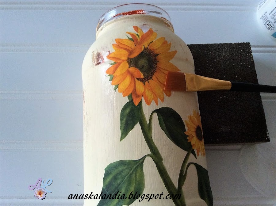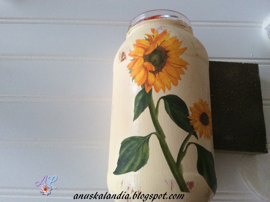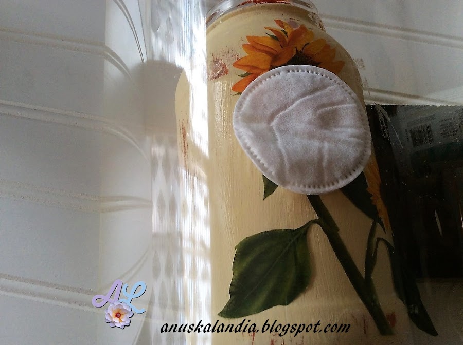 6.- Con un pincel suave y cola de decoupage, lo paso por la superficie del frasco que me vaya a ocupar el girasol. Coloco el motivo encima, procurando que no se arruge y siguiendo las indicacioes de mis buenas amigas, Myriam de Ideado a mano y Lola de El refugio de Lirtea, que me dijeron como hacerlo en mi post anterior de las bolas navideñas. Pongo un acetato encima del girasol, con un algodón desmaquillante (era lo que tenía a mano) hago presión suavemente, pasando por todo el girasol, hasta que quede completamente pegado y sin arrugas.