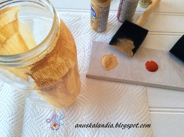 Colocamos pintura del color camello en el rodapiés. He elegido estos tonos, porque creo que son muy otoñales. Con la esponja o el pincel, pintamos la mitad del frasco (como prefieras, de arriba a abajo o de izquierda a derecha). Seguidamente, con la pintura naranja tostado, hacemos la misma operación y pintamos la otra mitad. Dejamos secar.