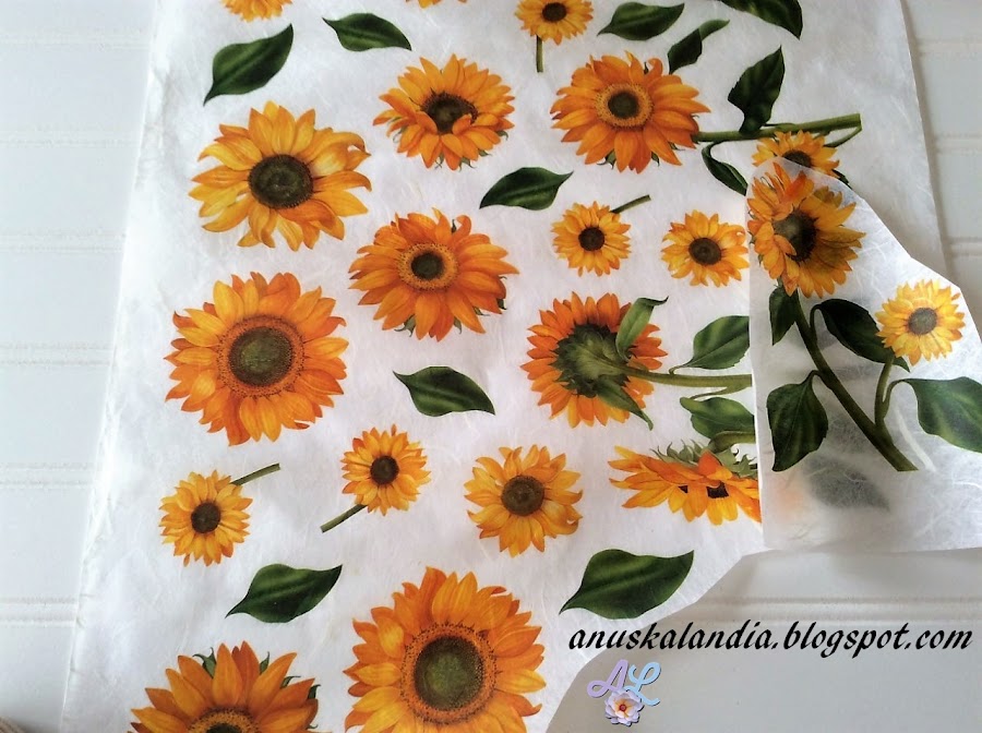 5.- Ahora, vamos a recortar el motivo que queramos pegar. Yo he elegido uno de girasoles en papel de arroz. Elegí este, porque ya sabéis lo que me gusta el tema flores. Buscando en internet cuáles eran de otoño, encontré que el girasol era una de las más características. Teniendo en cuenta, que hasta ahora, esta flor me ha dado grandes alegrías, me decanté por ella.