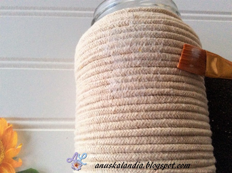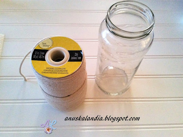 1.- Limpiamos bien el frasco (igual que el anterior). Ponemos una gota de pegamento instantáneo en la parte baja del frasco y colocamos el cordón de macramé. Asegúrate, de que está bien pegado.