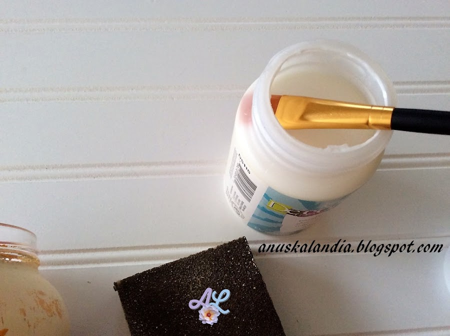 7.- Pasamos cola decoupage por encima y dejamos secar. Seguidamente pasamos al siguiente frasco.