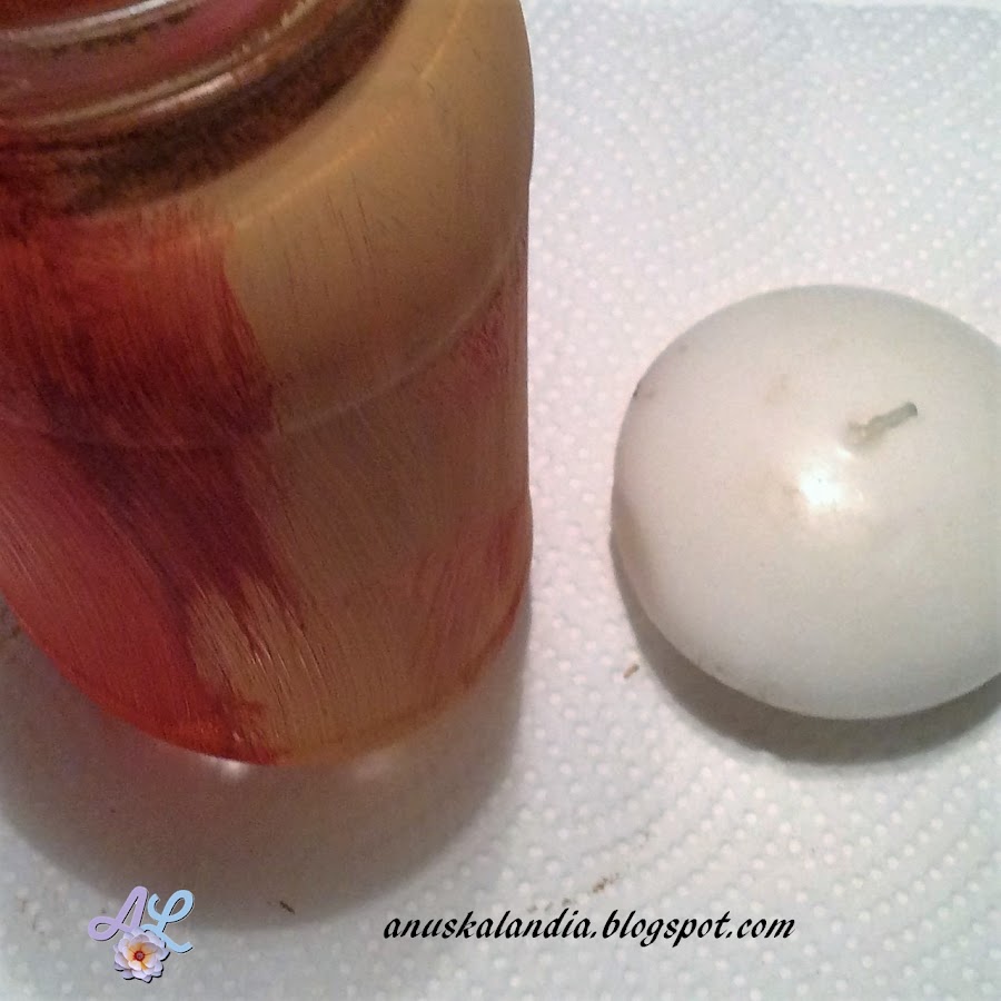 4.- Cuando la pintura esté seca, procedemos a pasar la lija por las zonas del frasco que prefiramos, así conseguiremos decapar y se verán los tonos otoñales interiores.