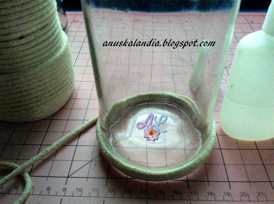 No utilices silicona fría ni caliente, a mi al menos no me pegaba. No pongas pegamento en cada trozo de cordón, hazlo así, en las dos o tres primeras vueltas solamente. A partir de ahí, pon una gota cada tres o cuatro vueltas. Eso sí, el cordón tiene que ir bien apretado y muy bien ajustado a la línea anterior. Así, hasta que llegues al cuello del frasco.