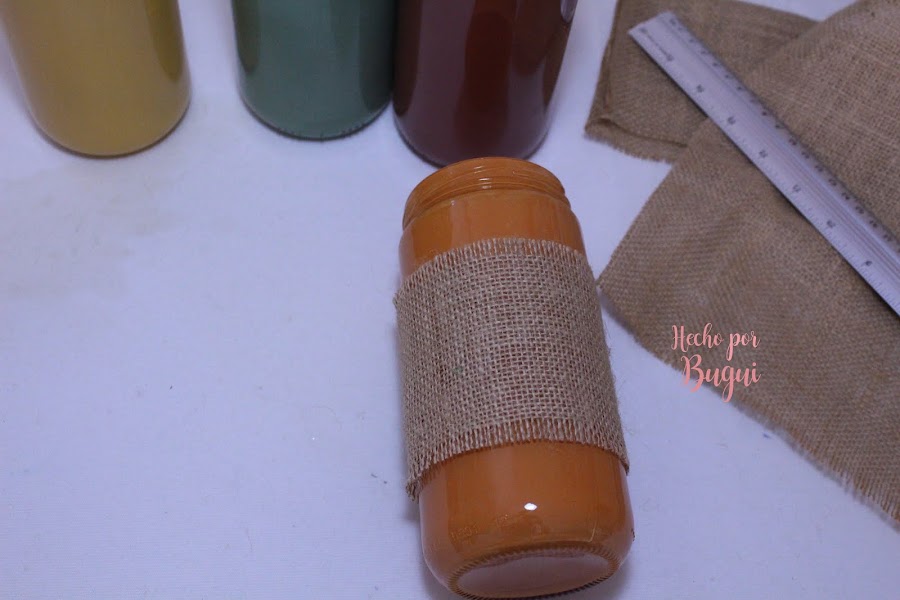 Mientras seca la pintura vamos cortando los trozos de tela de la medida de la circunferencia del bote.