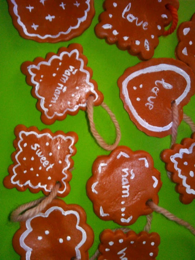 Estiramos la masa y con los moldes de galletas hacemos los cortes y un agujero en un extremo. Hay que dejar la masa que se endureca unas horas.