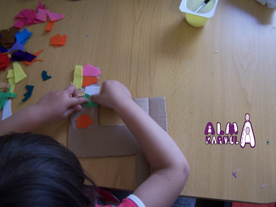 El primero lo decoramos con unos retales de fieltro que tenemos en casa, poco a poco fuimos dándole la cola,ya que si lo hacemos todo de golpe, la cola se nos seca.