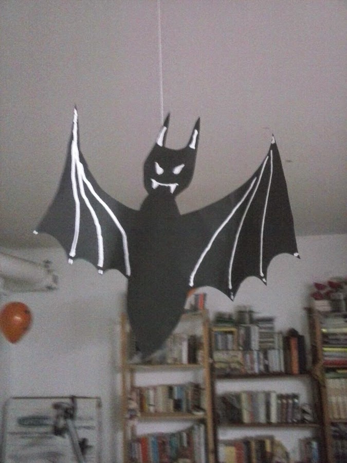 La decoración es totalmente low cost, nos fuimos a un bazar chino y compramos un par de bolsas de telarañas (mal hecho porque con una nos dió para toooooooodo el sótano) unos cuantos globos naranjas que después pintamos a modo de calabazas, y cartulina negra para hacer murciélagos y demás criaturas de la noche.