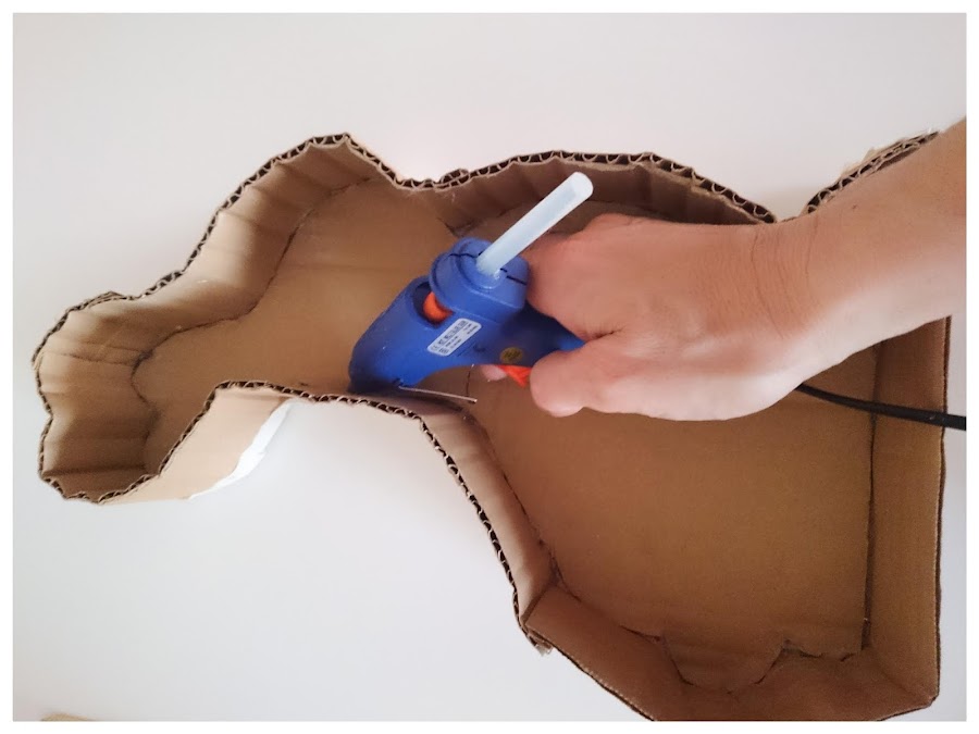 Con la pistola de silicona caliente, ir aplicando un cordón de silicona por todo el interior del molde, que hemos fabricado, con el fin de evitar fugas en él.