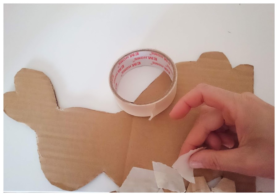 Y con la cinta de carrocero ir pegando toda la tira de cartón, que hemos recortado en el paso anterior,.