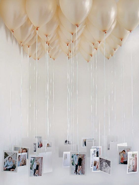 En salones cerrados también quedarán genial, una idea es utilizarlos en el lugar donde quieras ubicar la mesa dulce, puedes inflar muchos globos perfectamente combinados con la paleta de colores que hayas elegido para el día de la celebración y atar a los extremos de las cintas, ya sean fotos divertidas, tarjetitas con mensajes de agradecimiento para tus invitados, frases motivadoras o frases con las que suelen comunicarse entre familiares y amigos que estarán presentes ese día!