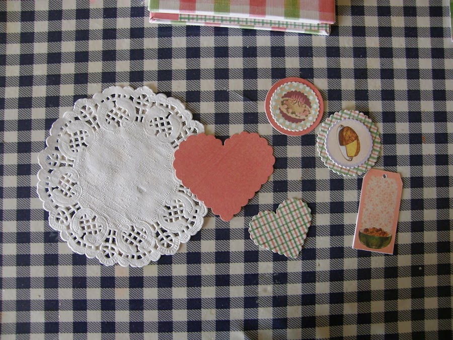 Use también una blonda pastelera y del mismo modo en que recorte el tag, hice otras dos etiquetas pegándolas sobre cartulinas , use también dos corazones troquelados, se pueden recostar con una plantilla sin problemas.