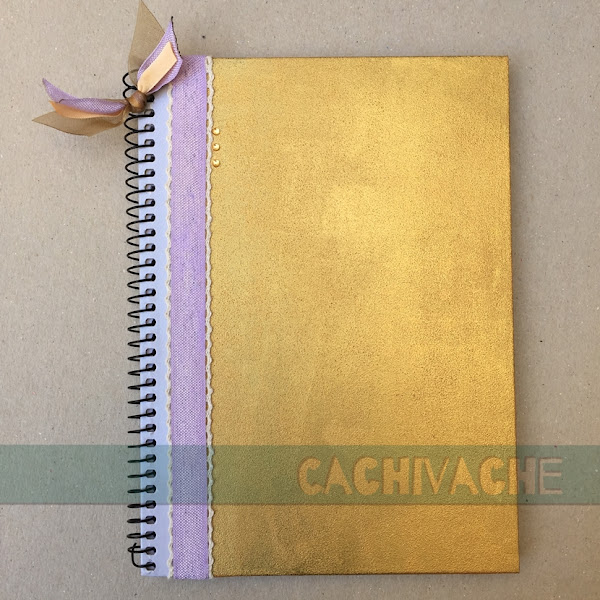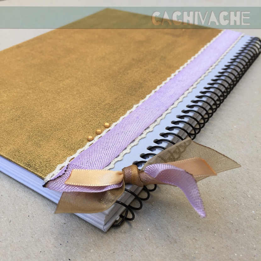 Con las fotos del paso a paso se puede ver cómo he transformado una libreta comercial en una mucho más personal.Lo primero que haremos será quitar el muelle o gusanillo, con la ayuda de unos alicates de punta, protegemos con cinta de carrocero lo que no queremos pintar. Pintamos la tapa, en mi caso he elegido pintura dorada. Quitamos la cinta y volvemos a pasar el muelle, cerrando en la punta para que no se salgan las hojas. Y decoramos con la cinta y puntilla.