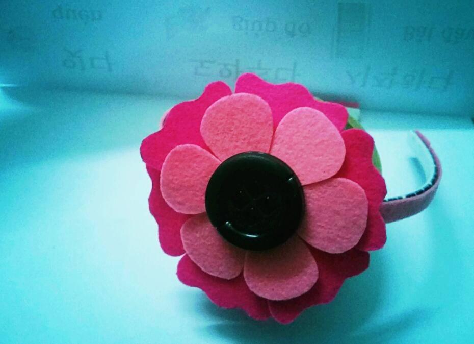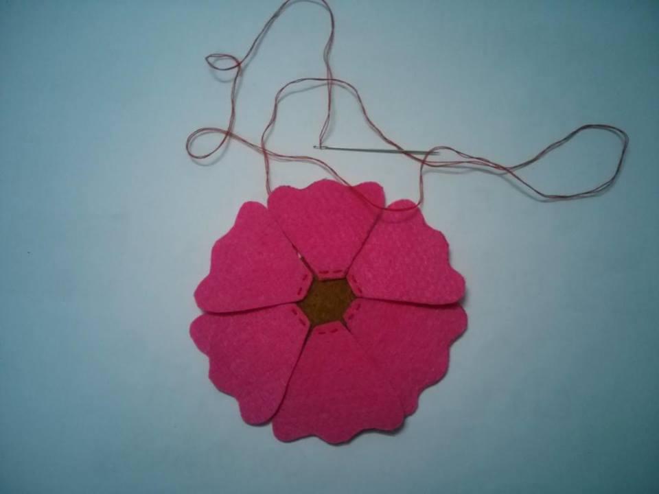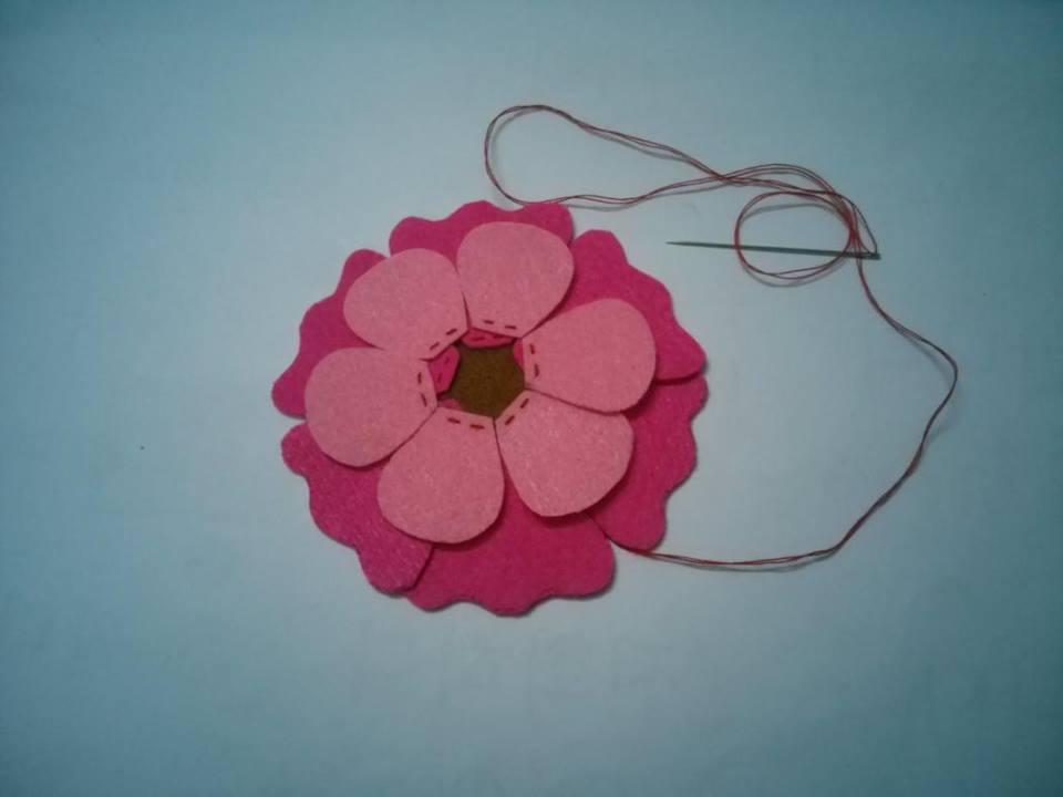 Pueden coser los pétalos con hilo y aguja o pegar con la silicona. Primero los más grandes y encima más pequeños. Decoramos con un botón o perlita.