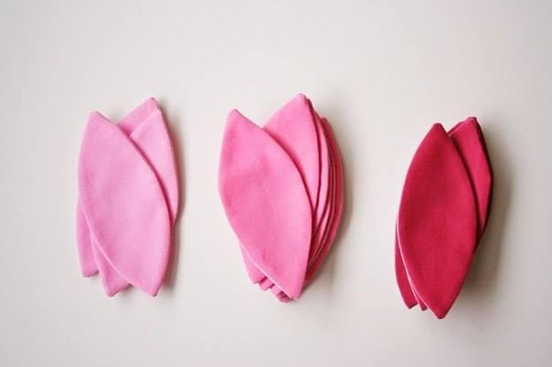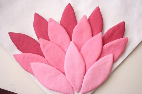 Linda y simple idea para decorar un bolso con flor de tela. Cosemos con la máquina de coser de tela de diferentes colores (en nuestro ejemplo son 3 tonos del color rosado) los pétalos. Los volteamos.